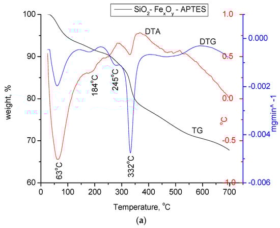 For amino-functionalized samples, two endothermic processes at 63 and 184 °C are observed in the temperature range of 25 to 200 °C, specifically for the physically adsorbed water on silica as the base material. As in the case of the initial non-functionalized samples, the material keeps losing water up to temperatures of 300 °C which takes place in accordance with the decomposition reactions of Fe sulfate hexahydrate. For all three samples, the mass loss in the temperature range of 280–420 °C is attributed to the thermal decomposition of the aminopropyl functional group, which is highlighted by the endothermic effects located between 328 and 336 °C.