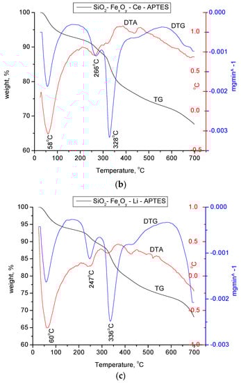(a) Thermogravimetric analysis of the SiO2−FexOy−APTES sample. (b) Thermogravimetric analysis for the SiO2−FexOy−Ce−APTES. (c) Thermogravimetric analysis for sample SiO2−FexOy−Li−APTES.