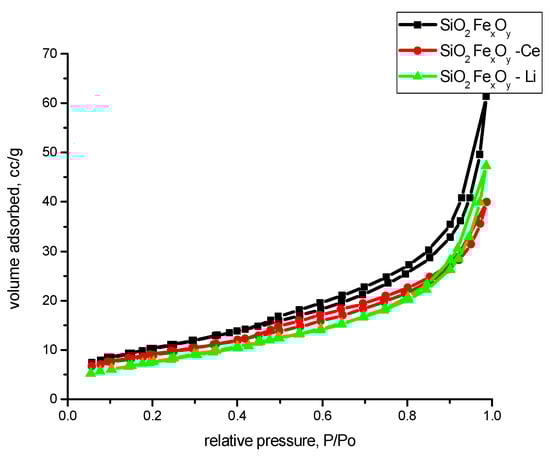 Nitrogen adsorption–desorption isotherms of the samples SiO2-FexOy, SiO2-FexOy-Ce, and SiO2-FexOy-Li.