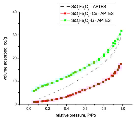 Textural parameters of SiO2−FexOy−APTES, SiO2−FexOy−Ce−APTES, and SiO2−FexOy−Li−APTES functionalized.