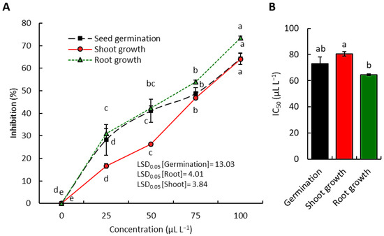 Phytotoxic activity of Prosopis farcta EO against seed germination and seedling growth of the weed D. aegyptium. (A) Concentration-dependent inhibitory activity, and (B) the inhibitory concentration of 50% (IC50). Different letters within each line in figure A or among the columns in figure B shows significant variation at p < 0.05.