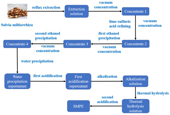 Salvia miltiorrhiza (Danshen), belonging to the Lamiaceae family, is the dried root and rhizome of Salvia miltiorrhiza Bge. It has the effects of activating blood circulation, dispelling blood stasis, clearing and activating the channels and collaterals, clearing the heart and removing irritation, cooling the blood, relieving pain, etc. It is commonly used in clinical practice to treat coronary heart disease [8,9,10], angina pectoris [11,12,13], and ischemic stroke [14,15,16]. The phenolic components in Salvia miltiorrhiza, including salvianolic acid B, danshensu, protocatechuic aldehyde, and rosmarinic acid, are considered the main active ingredients, which are generally extracted by water decoction. The decoction can be further purified by ethanol precipitation, extraction, and column chromatography to obtain Salvia miltiorrhiza purified extract (SMPE). In industry, the purified extract is used to produce Danshen injection, compound Danshen spray, Senxiong glucose injection, and so on. However, a large dose of Danshen injection may cause peripheral vascular toxicity [17]. In addition, in practice, taking a large amount of oral preparations of Danshen can also stimulate the stomach.