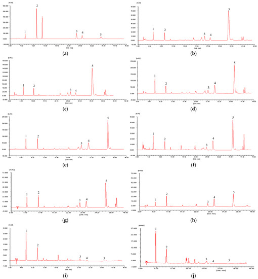 Typical chromatogram of the reference solution and samples: (a) reference solution, (b) salvia decoction, (c) aqueous extract concentrates, (d)lime-sulfuric acid refining solution, (e) first ethanol precipitation supernatant, (f) second ethanol precipitation supernatant, (g) first acidification supernatant, (h) alkalization solution, (i) thermal hydrolysis solution, and (j) SMPE. Peak 1 is danshensu, peak 2 is protocatechuic aldehyde, peak 3 is rosmarinic acid, peak 4 is lithospermic acid, and peak 5 is salvianolic acid B.