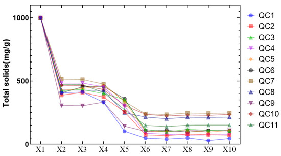 Variation in the total solid of raw materials, intermediates, and final products at each process stage.