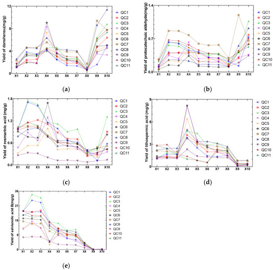 Variation in phenolic acid yield: (a) yield of danshensu; (b) yield of protocatechuic aldehyde; (c) yield of rosmarinic acid; (d) yield of lithospermic acid; (e) yield of salvianolic acid B.