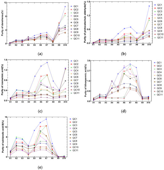 The Salvia miltiorrhiza used in tests QC1-QC3 was from the same batch, Batch 180913. Process and detection were the main causes of purified extract quality variation in these three tests. Batches 180927, 180901, 181001, 190801, 210911, 211101, 210811T, and 211022T were utilized in tests QC4-Q11, respectively. In these eight tests, herbs, process, and detection were the primary contributors to quality variations.