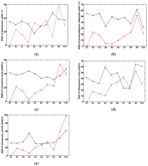 Variation in the yield of each phenolic compound: (a) RSD of danshensu yield; (b) RSD of protocatechuic aldehyde yield; (c) RSD of rosmarinic acid yield; (d) RSD of lithospermic acid yield; (e) RSD of salvianolic acid B yield. (○ represents data obtained with the same batch of Salvia miltiorrhiza; △ represents data obtained with the different batches of Salvia miltiorrhiza).