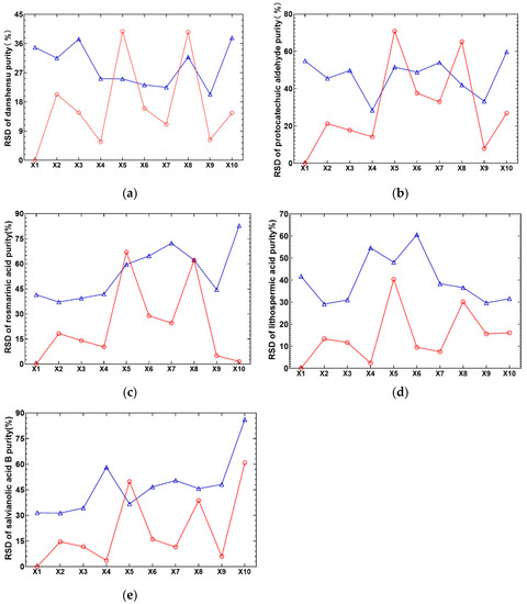 Variation in the purity of each phenolic compound: (a) RSD of danshensu purity; (b) RSD of protocatechuic aldehyde purity; (c) RSD of rosmarinic acid purity; (d) RSD of lithospermic acid purity; (e) RSD of salvianolic acid B purity. (○ represents data obtained with the same batch of Salvia miltiorrhiza; △ represents data obtained with the different batches of Salvia miltiorrhiza).