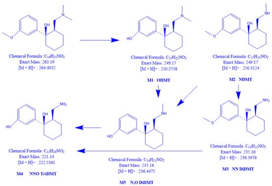 TD has around 20% plasma protein-binding and a therapeutic plasma concentration. When taken orally, TD is rapidly absorbed and has a 65–70% bioavailability. The elimination of TD from the human body primarily occurs via renal excretion after hepatic metabolism through N- and O-demethylation processes, facilitated via cytochrome P450 pathways, particularly CYP2D6. As a result, overdose or intoxication might result from a deficiency in these systems or the concurrent use of other drugs processed via the same hepatic pathways. TD’s analgesic effectiveness is primarily due to ODT (O-desmethyl TD), a pharmacologically active metabolite. Around 10–30% of the parent dosage in the urine is excreted unaltered [6,7]. TD and M1 (ODT) have half-lives of 5–6 and 7–9 h, respectively. Thus, regular dosage may cause bioaccumulation due to M1’s extended elimination half-life [8]. The six metabolic pathways that inculcate N-demethylation, O-demethylation, oxidative N-dealkylation, dehydration, cyclohexyl oxidation, and conjugation yield TD metabolites [9]. The primary metabolites are M5 (N,O-desmethyl TD) and its conjugates, M1 and its conjugates, and M2 (N-desmethyl TD), whereas M3 (N,N-desmethyl TD) and M4 (N,N,O-desmethyl TD) and their conjugates are only formed in minimum concentrations. Phase I reactions yield 11 metabolites, whereas phase II reactions generate 12, and the most active metabolite is M1 (Figure 1) [10].
