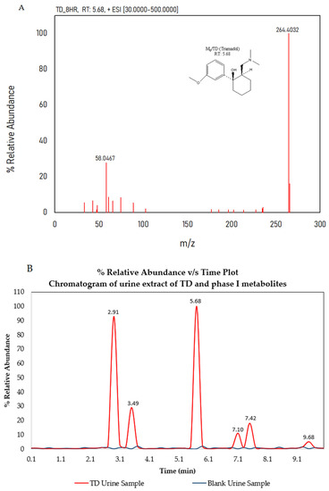 (A) Mass spectrum and (B) the TIC chromatogram of the urine extract (collected from a volunteer) of a TD and phase I metabolites (orange) and blank urine extract (blue) using CH3OH:H2O (35:65) with 0.2% HCOOH as the mobile phase at a flow rate of 0.5 mL/min using a HyPURITY Cl8 column.