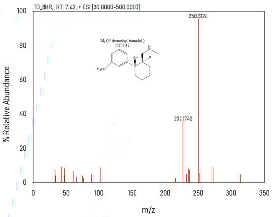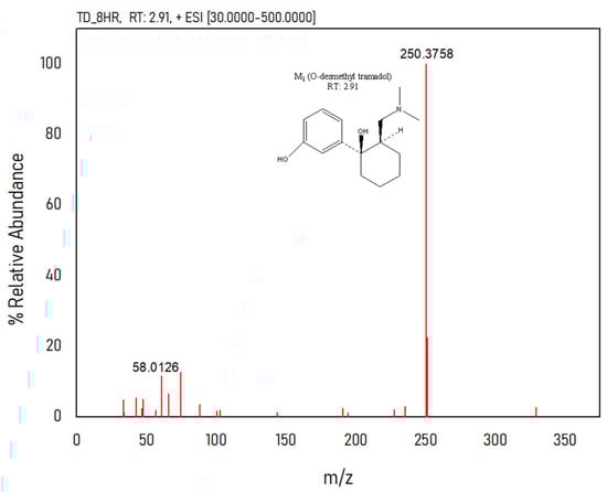 Mass spectrum of urine extract at RT: 2.91, m/z 250.3758 corresponding to the [M + H]+ ion of O-desmethyl TD (M1/ODMT).