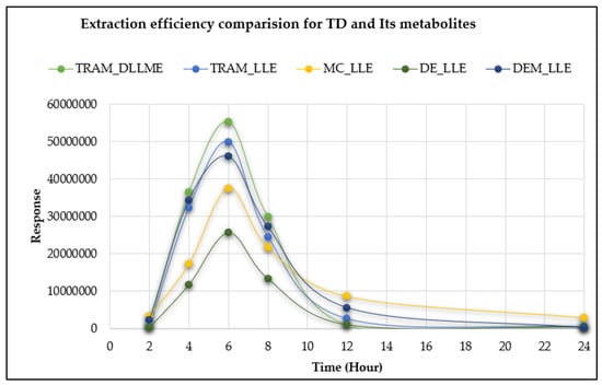 Both methods have been performed to accelerate extraction efficiency, as depicted in Figure 8. Thus, various combinations of dispersion and extraction solvents have been used, including chloroform (C), methanol (M), diethyl ether (DE), ethyl acetate (EA), etc. To conduct sample separation using DLLME, specific prerequisites must be achieved. The dispersing solvent must be completely soluble in water. Acetonitrile, acetone, and methanol are commonly utilized for this purpose. The solvent must be extracted to achieve a few characteristics, and it must be able to extract analytes. Additionally, it must be soluble in the dispersion solvent and sparingly soluble in water. Selecting the extracting and dispersing solvents carefully is necessary to achieve a significant enrichment factor. TD and its metabolites were extracted from human urine using a variety of procedures. Multiple organic solvents, such as diethyl ether, dichloromethane, tert-butyl methyl ether, and ethyl acetate, were used to achieve efficient extraction with the DLLME method. Extraction solvent (ethyl acetate and chloroform in the ratio of 1:3) and dispersion agent (methanol) were combined to create the best extraction method at a ratio of 1:2 for 10 min, and the extraction tubes were centrifuged at 4500 rpm. Using this procedure, the efficient extraction of TD along with the maximum number of metabolites was achieved.