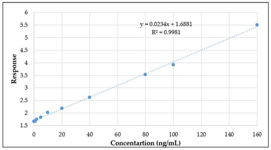 Using a weighted least squares approach, it was observed that the calibration curves for the urine test created with a peak area ratio (y) of TD versus drug concentration were linear across the concentration range of 0.1–160 ng/mL. The linear regression equations of the calibration curves are summarized in Table 2. The standard curve correlation coefficient was 0.9981 (Figure 9).