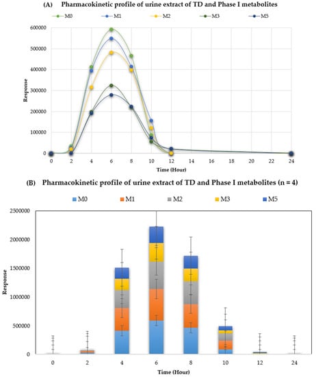 (A) The pharmacokinetic profile of the urine extracts of TD and phase I metabolites. (B) The average pharmacokinetic profile of the urine extracts of volunteers (n = 4).