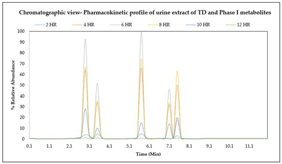 The TIC chromatographic view of the pharmacokinetic profile of urine extracts of TD and phase I metabolites.