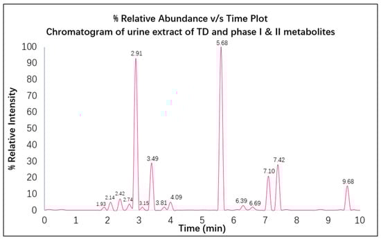 Represents the TIC chromatographic view of the separation of TD and phase I and phase II metabolites extracted from urine extract.