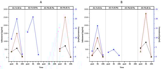 Results of urine analysis of all four arms (A1–A4) for one participant (T22) of this study. (A) Determined concentrations (non-adjusted); (B) concentrations adjusted for the specific gravity of the urines. Administration regime of formoterol (Fo), salbutamol (Sa), and placebo (Pla) is indicated in the header. Samples were collected 15–45 min after exercise (post), three hours after exercise (3 h), and 24 h after exercise (24 h). Sample preparation included enzymatic cleavage of glucuronides by β-glucuronidase. Concentrations of salbutamol (black rhombs) and salbutamol-4′-O-sulfate (red triangles) relate to the left Y-axes, and concentrations of formoterol (blue squares) relate to the right Y-axes.