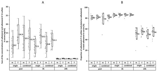 (A) Total salbutamol concentrations in serum calculated as sum of parent compound and salbutamol-4′-O-sulfate and (B) proportion of salbutamol-4′-O-sulfate (as % of the total salbutamol) in samples collected directly after exercise (post), after three hours (3 h), and after 24 h (24 h). Subgroups represent data from trials after single dosage of salbutamol (single) or a combined dosage of salbutamol and formoterol (combined). Data from male (m) and female (f) participants are presented separately. Individual data points are shown left to box. Labeled empty squares in the box represent mean values, solid line in the box is median, and upper and lower ends of box represent SD. Whisker shows maximum and minimum values of data range in (A) and confidence interval (p = 0.01) in (B).