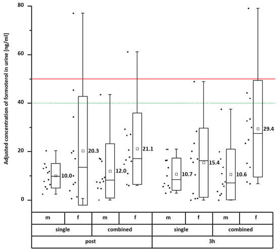 Adjusted urinary concentrations of formoterol in urine samples collected directly after stress (post) and after three hours (3 h). Note that 24 h results are not shown. Sample preparation included enzymatic cleavage of glucuronides by β-glucuronidase. Results are shown after correction for specific gravity of the urine (adjusted concentration). Subgroups represent data from trial arms after single dosage of formoterol (single) or a combined dosage of formoterol and salbutamol (combined). Data from male (m) and female (f) participants are presented separately. Individual data points are presented from left to box. Labeled empty square in the box represents mean value, solid line in the box is median, upper and lower end of box represent SD, and whiskers shows maximum and minimum values of data range. Green dotted line is WADA threshold (40 ng/mL), and red solid line is WADA decision limit (50 ng/mL) for formoterol in urine after indicated and permitted use in athletes.