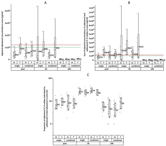 (A) Adjusted urinary concentrations of salbutamol, (B) total salbutamol concentration (joined salbutamol and salbutamol-4′-O-sulfate calculated as salbutamol equivalent), and (C) proportion of salbutamol-4′-O-sulfate (as salbutamol equivalent) in total salbutamol in urine. Sample preparation included enzymatic cleavage of glucuronides by β-glucuronidase. Results are shown after correction for specific gravity of the urine (adjusted concentration). Samples were collected directly after exercise (post), after three hours (3 h), and after 24 h (24 h). Subgroups represent data from trials after single dosage of salbutamol (single) or a combined dosage of salbutamol and formoterol (combined). Data from male (m) and female (f) participants are presented separately. Individual data points are shown left to box. Labeled empty squares in the box represent mean values, solid line in the box is median, upper and lower ends of box represent SD. Whisker in (A,B) shows maximum and minimum values of data range and, in (C), confidence interval (p = 0.01). In (A,B), the red solid line is decision limit (1200 ng/mL), and the green dotted line is threshold (1000 ng/mL) based on WADA regulations.