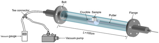 This experimental study focuses on the effect of heating temperature and temperature gradient on lithium metal vapor and the condensation law of Al-Li alloy metal vapor. The raw material, produced by Shanghai Binlian Industrial Co., Ltd. (Shanghai, China), used in the lithium vapor condensation experiment consisted of 99.9% lithium particles; its chemical composition (mass percentage) is shown in Table 2. The Al-Li alloy, obtained by reducing LiAlO2 with coking coal under vacuum conditions and condensing with aluminum liquid, was used as the raw material for this experiment. The composition of the Al-Li alloy was 7.87 % of lithium in aluminum. The experimental equipment was a vacuum grading condensing furnace with a controllable multi-temperature zone, as shown in Figure 2. The reactor consisted of three units: a heater, a catheter, and a condenser. The furnace had five heating zones and six insulation zones from left to right. The length of the heating zone was 12 cm, and there was a 6 cm heat insulation zone between each adjacent heating zone. Figure 3 shows the furnace temperature distribution, where the insulation was fixed and the heating zone temperature could be controlled and changed as needed. The sample was placed in the crucible and pushed into a quartz tube lined with a layer of graphite paper. A vacuum pump was used to evacuate the air in the system. The sample was placed in a crucible and inserted into a quartz tube. The heating rate was maintained at 8–10 K/min. After the experiment, the system was cooled to room temperature. The condensation products were then removed from the condenser for analysis.