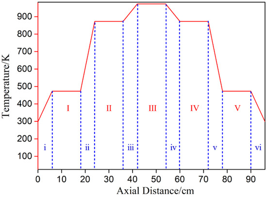 Schematic diagram of furnace temperature distribution (the heating zone: I–V; the heat insulation zone: i–vi).