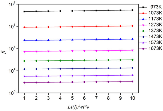 Based on the Wilson equation, which predicts the Al-Li alloy activity coefficient at different temperatures, in combination with the saturated vapor pressure and Equation (2), the separation coefficient of the Al-Li alloy in a range of 973–1673 K was calculated, as shown in Figure 5. In the calculation of the separation coefficient, the influence of temperature on the activity coefficient is considered; thus, the accuracy of the calculated separation coefficient is guaranteed. It can be seen from Figure 5 that the separation coefficient is β >> 1 when the lithium content is 1–10%. This indicates that in the Al-Li alloy system, vacuum distillation can be used to separate aluminum and lithium under certain conditions.