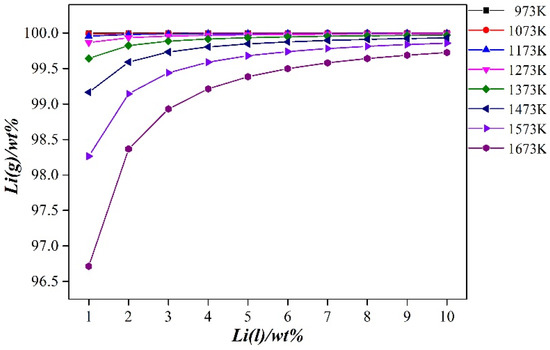 From Figure 6 (calculated using Equation (3)), it can be seen that during the vacuum distillation process of the Al-Li alloy, when the distillation temperature is constant, the lithium volatilizing into the gas phase increases as the lithium content in the binary alloy increases. When the lithium content in the binary alloy is fixed, the lithium content volatilized into the gas phase decreases as the distillation temperature increases. The lithium content in the binary alloy varied from 1 to 10%, the distillation temperature was in a range of 973–1673 K, and the lithium content volatilized into the gas phase was between 96.713 and 99.998%. Therefore, the method of vacuum distillation can effectively separate aluminum and lithium in the Al-Li alloy. In the gas phase, metallic lithium with a purity of more than 99.99% can be obtained.