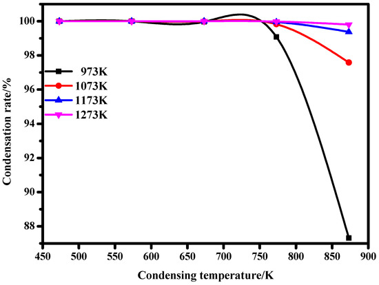 As can be seen from Figure 7, when lithium metal is condensed from 973 K, 1073 K, 1173 K, and 1273 K to 473 K, 573 K, 673 K, 773 K, and 873 K, respectively, the condensation rate of lithium vapor increases gradually. When the condensation temperature is 673 K, the condensation rate of lithium vapor almost reaches 100%. This indicates that the condensation efficiency of lithium metal vapor is high when the condensation temperature is lower than 673 K, which is conducive to the condensation of lithium metal vapor.