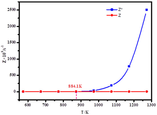 Figure 8 shows the relation between the number of collisions per unit time and temperature of lithium in a range of 573 K–1273 K. Z* represents the relationship between the number of collisions of lithium atoms and temperature when the pressure is saturated vapor pressure, that is, p = p*, Z represents the relationship between the number of atomic collisions and temperature when the pressure in the system is p = 10 Pa. As can be seen from the figure, Z* generally decreases when the temperature is reduced from 1273 K to 573 K, but when the temperature is gradually reduced from 1273 K to 884.1 K, Z* drops sharply. When the temperature is lower than 884.1 K, Z* slowly decreases with the temperature. For Z, Z gradually increases as the temperature decreases. If Z* > Z, that is, when the temperature is higher than 884.1 K, the evaporation of Li atoms at this time increases, which is not conducive to Li agglomeration. If Z* < Z is, that is, when the temperature is less than 884.1 K, at this time, when the system pressure is 10 Pa, the number of collisions of Li atoms is greater than the number of collisions at saturated vapor pressure, which is conducive to Li nucleation and vapor condensation. Therefore, in the condensation of lithium vapor, when the temperature of controlling the condensation zone is lower than 884.1 K, it is conducive to the condensation of lithium metal vapor.