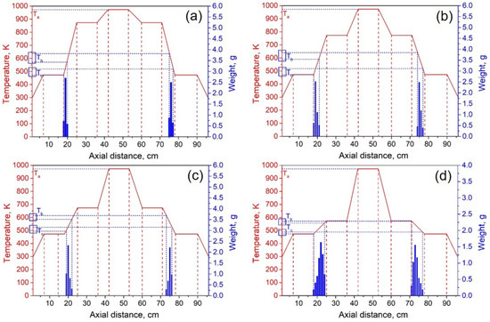 The experimental system pressure was 10 Pa. According to the theoretical results, the temperature of heating zone III was set to 973 K, and the temperatures of I and V were 473 K. By adjusting the temperature of heating zones II and IV, we investigated the effect of condensation temperature gradient on lithium condensation location at temperatures of 873 K, 773 K, 673 K, 573 K, and 523 K. Figure 9 shows the experimental results of the condensation position of lithium vapor in the quartz tube at temperatures of 873, 773, 673, 573, and 523 K in heating zones II and IV. The abscissa indicates the position of the condensing furnace from left to right, the solid red line indicates the temperature of each location in the furnace, and the blue column indicates the mass of lithium condensate at that location. Ta represents the temperature of the heating zone, Tb represents the temperature at which lithium vapor starts to condense, and Tc represents the minimum condensation temperature of lithium vapor.