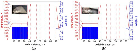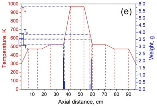 It can be seen from Figure 9a–e that as the temperature of the heating zone II gradually decreased from 873 to 523 K, the temperature gradients of III and II increased in sequence, while the gradients of I and II gradually decreased. As the temperature decreased, the position of the lithium vapor condensation zone tended to move to the right, that is, in the direction of III, and the range of condensation gradually increased. However, the location of condensation was near the heat insulation layer. When the temperature was lowered to 523 K, the location of the condensing zone changed greatly and moved to III. Since heating zone III was used as the volatilization area of the metal, the positions and temperature settings of the condensation zones on both sides were completely symmetrical. Therefore, the condensation area and temperature of the lithium vapor on both sides of III are theoretically the same. However, the experimental results found that the location of lithium vapor condensation at the vacuum pump end was farther from III than at the other side, and the condensation temperature was slightly lower than on the other side. This shows that the suction power of the vacuum pump has a certain effect on the condensation of the metal vapor. Combining the condensation temperature range of lithium vapor, we found that the optimal condensation temperature range under vacuum was 523–560 K.