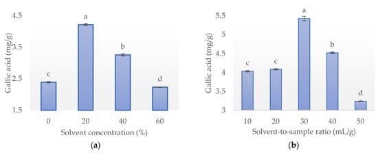 Commonly used solvents used in the extraction of phytochemicals include methanol, acetone, ethanol, hexane, and water. However, ethanol is considered safer in comparison to methanol due to less toxicity [22]. Water has been extensively used in extraction because it is easily available, nontoxic, and inexpensive as compared to other solvents. Extraction with water, however, is less efficient in comparison to a combination of water and ethanol [22]. Therefore, in the research described here, aqueous ethanol was utilized. The efficacy of aqueous ethanol on extraction yields of gallic acid was assessed for different ethanol concentrations using a solvent-to-sample ratio of 10 mL/g, 40 °C temperature, and extraction time of 10 min (Figure 1a). As the ethanol concentration rose from 0 to 20%, a significant increase in gallic acid concentration was observed. These concentrations, however, decreased as the concentration of ethanol increased from 20% (4.21 ± 0.04 mg/g) to 40% (3.25 ± 0.03 mg/g) and further decreased as ethanol concentration increased to 60% (2.23 ± 0.01 mg/g). These results were similar to previous research findings that when ethanol is used in combination with water, it shows remarkable results as it was reported that the maximum phenolic content was observed at a 50% level when the ethanol-water binary system was evaluated [39]. As extraction with 20% ethanol showed the greatest efficiency in the research described, 20% ethanol was used in the successive experiments.