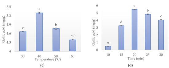 Effect of independent extraction variables on the yield of gallic acid from MSK (a) Solvent concentration (%); (b) Solvent-to-sample ratio (mL/g); (c) Temperature (°C); (d) Time (min). Letters (a–e) present significance (p < 0.05) among levels.