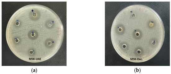 Antimicrobial activity of extracts (a) MSK-UAE and (b) MSK-Dec. against Clostridium perfringens.