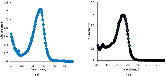 Spectrophotometric analysis was performed to calculate the wavelength of maximum absorbance of both the dye solutions (DRIM blue HS-RL and DRIM black ep-B) using 25 ppm concentration of dye solution. Scanning the DRIM blue HS-RL and DRIM black ep-B dyes solution through 340 nm to 1000 nm wavelength via the UV visible spectrophotometer revealed that they showed maximum absorbance at wavelengths of 610 nm and 590 nm, respectively [47], as presented in Figure 1.