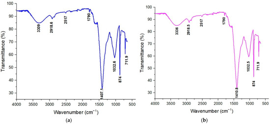 Fourier transforms infrared spectroscopy is a fundamental technique used for the functional group identification of different species [48]. Absorption peaks were observed at 711, 1390, 1795 and 2513 cm−1 which show the presence of calcite (CaCO3) in the composite [49]. The absorption peak observed at 874 cm−1 revealed the presence of silicate in the material. The absorption peak at 710 cm−1 showed the symmetric vibration of Ca-O bond of CaCO3 and the absorption peak observed at 1410 cm−1 is assigned to the asymmetric stretching vibrational frequency of the carbonate ion [50]. The absorption peak observed at 3309 cm−1 shows the OH while the absorption peak observed at 2918 cm−1 shows the C–H stretching band. There was no substantial difference between the two spectra. The spectra of the potassium ferricyanide-treated composition have shown a shift of the OH band to a higher vibration frequency (Figure 2).
