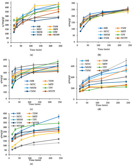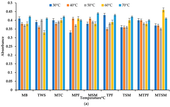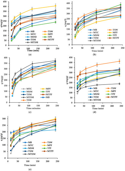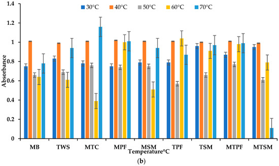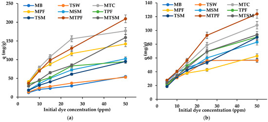 The effect of temperature was investigated at an initial dye concentration of 50 ppm, adsorbent dose of 0.005 g, contact time of 240 min and temperatures of 30, 40, 50, 60 and 70 °C (Figure 8a,b). In the case of DRIM blue (Figure 8a), MPF and TSM showed maximum removal efficiency at 30 °C, MTC and TPF at 40 °C, MB and MTSM at 50 °C, and MSM and MTPF showed maximum efficiency at 60 °C. The above results revealed that adsorption may be endothermic as well as exothermic that vary from adsorbent to adsorbent. In the case of DRIM black (Figure 8b), MB, TSW, MTC, and MSM, showed maximum adsorption capacity at 60 °C and MTSM showed maximum capacity at 70 °C, which gives us the evidence of an endothermic adsorption between these adsorbents and dye. Increased adsorption at high temperature is due to the increased number of available active sites but to a certain limit, it is also because further increase in temperature can cause hindrance due to high mobility of the dye molecules [56].