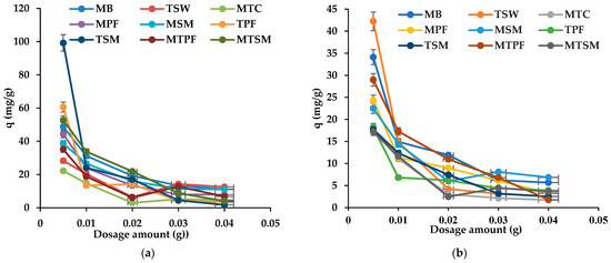 In the case of DRIM blue, as the dosage of the adsorbent was increased from 0.005 g to 0.04 g, adsorption capacity of different adsorbents decreased: MB (48 mg/g to 11 mg/g), TSW (28 mg/g to 12 mg/g), MTC (22 mg/g to 4 mg/g), MPF (44 mg/g to 7 mg/g), MSM (38 mg/g to 11 mg/g), TPF (60 mg/g to 3 mg/g), TSM (99 mg/g to 2 mg/g), MTPF (35 mg/g to 7 mg/g), and MTSM (53 mg/g to 4 mg/g). For DRIM black, as the dosage of the adsorbent was increased from 0.005 g to 0.04 g, adsorption capacity of different adsorbents decreased: MB (34 mg/g to 5 mg/g), TSW (42 mg/g to 2 mg/g), MTC (17 mg/g to 1 mg/g), MPF (24 mg/g to 3 mg/g), MSM (22 mg/g to 6 mg/g), TPF (18 mg/g to 3 mg/g), TSM (17 mg/g to 2 mg/g), MTPF (28 mg/g to 1 mg/g), and MTSM (17 mg/g to 3 mg/g).