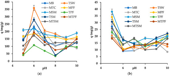 The adsorption capacity is significantly influenced by pH. To investigate the effect of pH on the adsorption capacity of different adsorbents, pH range from 5 to 10 was studied. Solutions of different pH were prepared using 0.1 M NaOH and 0.1 M dilute HCl solution. These experimental solutions were shaken for 2 h at 300 rpm on an orbital shaker. Figure 9a,b show that the most favorable adsorption occurred at pH 6 and 5 for DRIM blue HS-RL and DRIM black ep-B, respectively. With increasing pH of the solutions, adsorption capacity was reduced because they are reactive anionic dyes. Higher adsorption at acidic pH was due to the presence of excessive H+ ions on the surface of the adsorbent, so there is more attraction for the neutral charged anionic dye. Consequently, the adsorption of the anionic dye increased [57].