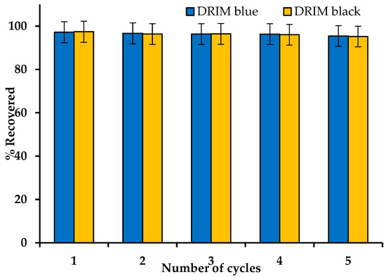 Investigating the reusability of the adsorbent for DRIM blue HS-RL and DRIM black ep-B dyes.