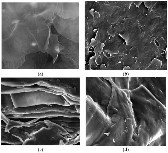 FESEM images for (a) GO (×50,000), (b) BGO (×50,000), and (c) 3D/BGO before (×2500) and (d) after (×2500) AMI adsorption (×magnifications).