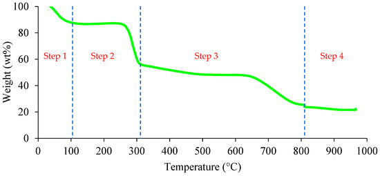 TGA is a useful technique for investigating the thermal decomposition behaviour of an adsorbent. The thermal decomposition plot of the 3D/BGO adsorbent is shown in Figure 3. The thermogram for 3D/BGO consisted of four major steps, wherein the first step (37–106 °C) was the removal of moisture of approximately 12.5 wt%. The second and third steps (106–809 °C) involved the devolatilization of 3D/BGO. In the second step from 106 to 316 °C, the thermal degradation of oxygenated groups and depolymerization of functional groups including the glycosidic chain and carboxyl groups of CCS [33] occurred, while further volatile matter was decomposed in the third step (316–809 °C). The existence of this step in the thermogram for 3D/BGO implied that CCS was incorporated into the adsorbent. The total volatile matter in the adsorbent was approximately 62.3 wt%. In the final step, negligible weight loss was experienced and the sample weight became constant at 960 °C. As compared with GO, 3D/BGO has better thermal stability with a higher moisture content and final weight [34]. Therefore, the incorporation of boron into the graphene lattices enhanced the thermal stability of the 3D GO structure.