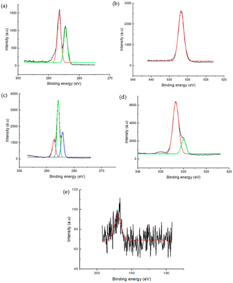 The deconvoluted C1s spectra revealed that GO possessed functional groups of C–C and C–O corresponding to binding energies of 284.10 and 286.31 eV, respectively [43]. Similarly, the 3D/BGO adsorbent exhibited carbonaceous functional groups such as the COOH (288.2 eV), C–C (285.77 eV) and C–O groups (284.25 eV) [44]. The O1s spectra shown in Figure 5b,d revealed that GO possessed the O–C groups (531.75 eV) while 3D/BGO contained the O–C and O=C groups, as evident by the peaks at 531.65 and 530.01 eV, respectively [43]. The B1s spectra revealed that the 3D/BGO adsorbent has a characteristic peak at 193.10 eV upon deconvolution, and this was ascribed to the presence of BCO2 groups [45]. This study indicated the presence of bonding between boron, oxygen and carbon atoms, thus initiating the AMI adsorption mechanism through interactions with boron–oxygen–carbon groups in 3D/BGO.