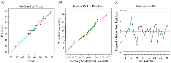 The adequacy of the model can be further validated by diagnostic plots such as the normal percentage distribution versus externally studentized residues (Figure 6b). The linear pattern of the plot showed low variance, which suggested goodness of fit of the predicted model and confirmed that normally distributed error terms existed [46]. Therefore, the model could be used to describe the adsorption of AMI onto 3D/BGO without model reduction. Figure 6c delineates the residual vs. run plot for the adsorption of AMI onto the 3D/BGO adsorbent. The externally studentized residuals were randomly distributed for all experimental runs. It was also observed that the residual magnitudes fell within the limits. The magnitude of the residual of each experiment allows the identification of potential outliers when the magnitude surpasses the general threshold of ±4% standard deviation. As there were no outliers found, the model was deemed accurate for the adsorption of AMI onto the 3D/BGO adsorbent.