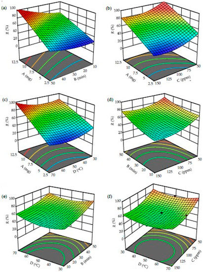 Three-dimensional response surface plots were used to assess the simultaneous effects of two factors on R (%), while the other two factors were kept at their optimum conditions. The surface response plots for the interactions between dosage (A, mg), time (B, min), initial concentration (C, ppm) and temperature (D, °C) are depicted in Figure 7.