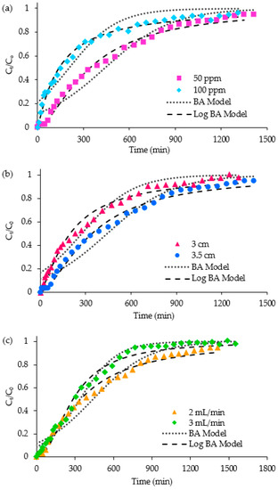 Overall, the column data were better represented by the modified models of logarithm transformation [29]. The Log Bohart–Adams model has effectively portrayed the asymmetric breakthrough curves for the adsorption at different column parameters, as shown in Figure 8a–c. Generally, a higher adsorption capacity and longer breakthrough time were achievable using a longer bed and lower initial concentration.