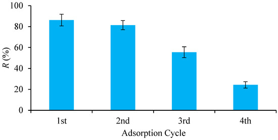 The costs of developing new adsorbents and disposal of spent adsorbents are the major factors governing the viability of the adsorption process [48]. Hence, regeneration of spent adsorbents can assist in minimizing cost and pollution. Generally, an eluting agent is applied to break the bonds between the adsorbent and adsorbate during regeneration [49]. In this study, pure ethanol was applied to regenerate the 3D/BGO adsorbent. The AMI adsorption efficiency of the 3D/BGO adsorbent for four adsorption cycles is demonstrated in Figure 9. Ethanol showed high removal efficiencies for the second and third adsorption cycle of 81.37% and 55.51%, respectively. Therefore, ethanol was a promising desorbing agent to remove AMI from the 3D/BGO adsorbent owing to its high regeneration efficiency.