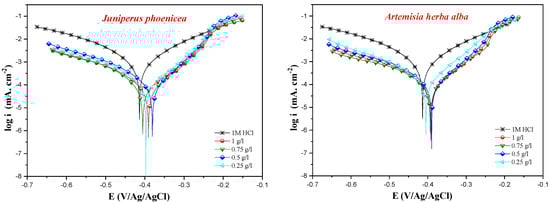 Polarization curves of mild steel in 1 M HCl in the presence of various concentrations of the Juniperus phoenicea and Artemisia herba-alba inhibitors.