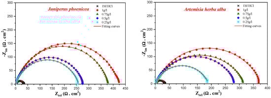Impedance diagrams in the Nyquist plots of mild steel obtained in 1 M HCl in the presence of different concentrations of Artemisia herba-alba and Juniperus phoenicea inhibitors.